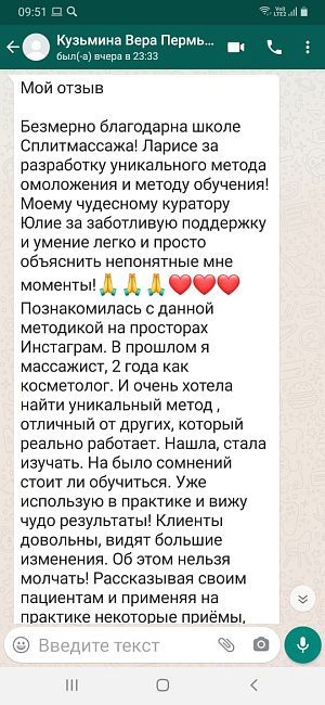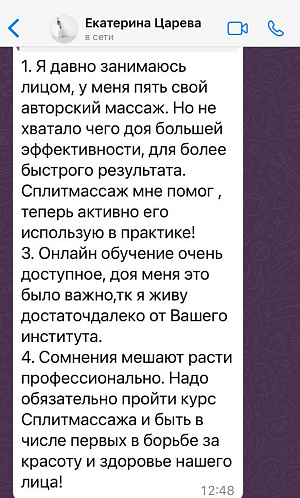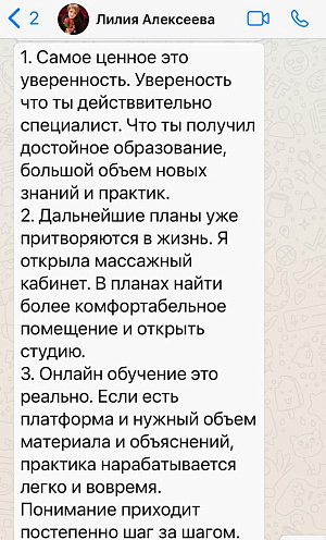 Онлайн формат позволяет проходить обучение из любого города мира в удобное для вас время. На связи всегда личный преподаватель-куратор, практикующий Специалист Сплитмассаж. После окончания и во время обучения на дистанционном курсе можно посетить очный семинар-практикум